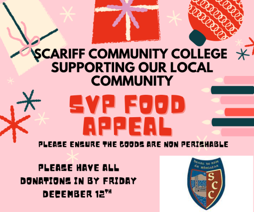 Scariff Community College is proud to support our local community this Christmas in conjunction with Saint Vincent de Paul. Our TY team is leading a school-wide Christmas Hamper Appeal, and we are inviting every student to contribute at least one food item/ one luxury food item suitable for Christmas hampers. Suggested items include non perishable food , a box of chocolates, a small selection box, biscuits, or any festive treat that would help bring a little extra joy to a family in need.